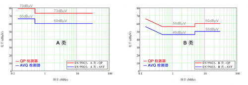 圖 1:使用準峰值和平均值檢測器的 EN 55022 A 類和 B 類傳導發射限值。
