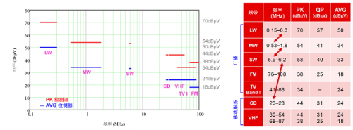 CISPR 25 測試的傳導發射均在 150kHz 至 108MHz 頻率范圍的特定頻帶內進行測量。具體而言,調節頻率范圍分布在 AM 廣播、FM 廣播和移動服務頻帶之間,如圖 2 中的圖象和表格所示。圖 2 還繪制了 CISPR 25 5 類(最嚴苛的要求)的相關限值圖象。盡管頻帶之間的帶隙允許更高的噪聲尖峰,但汽車制造商可能會根據其特定的內部 EMC 要求選擇擴展這些頻率范圍。這些要求通?;趪H IEC 標準,僅更改不同測試或限值的少量參數,其核心內容保持不變。