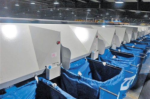 在江蘇省無錫市的一家快遞公司分揀中心里,包裹被傳送帶自動分發到代表不同地區的收集袋。