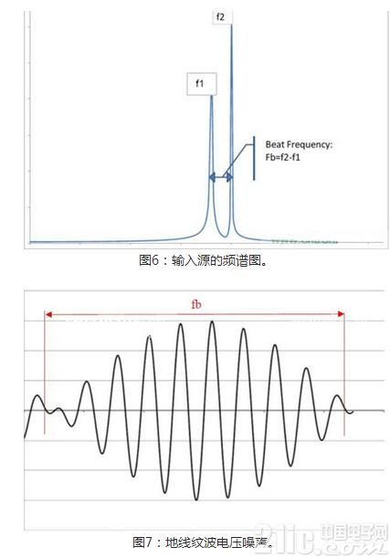 如上文所述,ISL8018可從主轉換器或外部時鐘加以同步。該特性在多個穩壓器的工作頻率彼此很接近時是必不可少的。圖6顯示了工作頻率分別為f1和f2的轉換器1和2。輸入可見一個“拍”頻(fb),亦即f1與f2之差。如果沒有隔離的話,該fb將在GROUND出現。輸出則可能如圖7所示,其中的包絡即為“拍”頻。