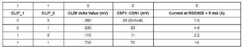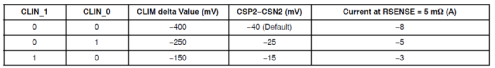 對4開關同步整流的升降壓控制在輕載模式、重載到輕載的轉換過程、輸出過壓保護、輸出從高電壓向低電壓調整過程中會有反向電流產生。CSP2/CSN2用于反向電流的檢測,當反向電流超過限流設定值時,如果輸出電壓在設定電壓范圍內,Q4會立即關斷防止反方向電流繼續增加。如果是在在降壓模式下,Q2關斷時Q4會重新導通。過流保護值可以通過I2C或電流檢測電阻進行設定,電流檢測電阻的選擇要保證CSP2-CSN2的電壓在過流時也不要超過100mV的運放差模電壓范圍。如果采用5毫歐檢測電阻,對應的峰值過流保護值如下表,默認值-8 A。