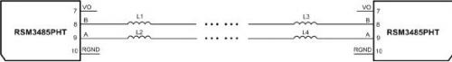 如圖 4所示的電路,兩個RSM3485PHT模塊AB接口分別串聯了磁珠,能夠達到IEC 61000-4-4 ±4kV,并能夠有效降低通信誤碼率,僅在電路中串聯了磁珠,非常的便宜有效,如果要求的EFT抗擾度等級更高,那么可以適當增加磁珠的數量。