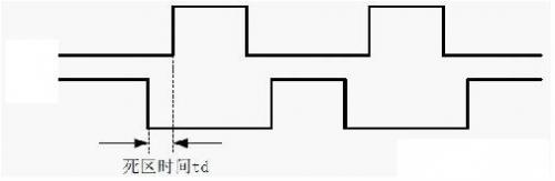 對于半橋、全橋和LLC諧振等一些H橋或半H橋的拓撲電源,PWM的死區時間設定對電源可靠性至關重要。實際上設定死區時間實則為了避免上、下管直通從而導致電源炸機,也就是說設定一段上、下管同時關斷的時間,在上管關斷后延遲一段時間再導通下管或在下管關斷后延遲一段時間再導通上管,如圖5所示td即為死區時間。