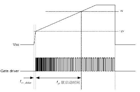 電源的軟啟動對降低場效應管和輸出二極管的尖峰電壓和尖峰電流有很大幫助,從而降低了其電壓應力和電流應力。但是對于LLC諧振電源來說,軟啟動對電源起機的可靠性非常關鍵;因為LLC電源的IC是通過高頻掃描的方式啟動的。如圖6所示在IC啟動時驅動PWM頻率會從設定的最高頻率開始慢慢恢復正常頻率,恢復時間也就是軟啟動時間。在此期間電源工作在不穩定狀態,軟啟動時間越長,啟動越安全;但軟啟動時間過長也會對電源帶容性負載能力和起機時間造成影響。